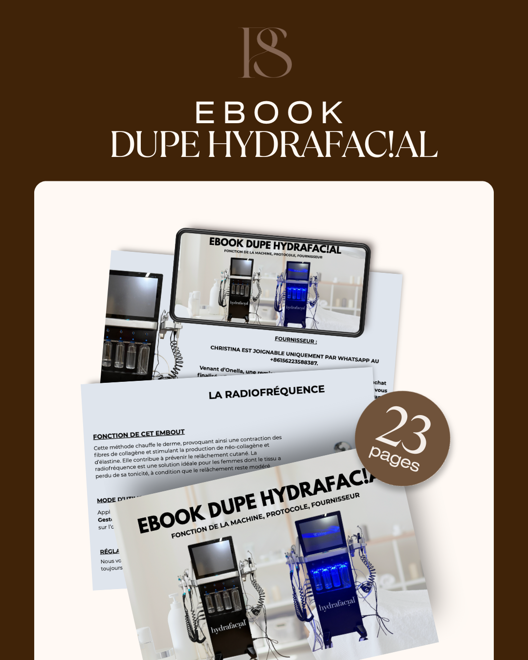 Découvrez notre e-book exclusif, conçu spécialement pour les professionnels déjà formés aux techniques Hydraclean, Hydraskin, Hydrafac!al, et autres. Si vous souhaitez approfondir vos connaissances et maîtriser le dupe de la machine Hydrafac!al, ce guide est fait pour vous.
